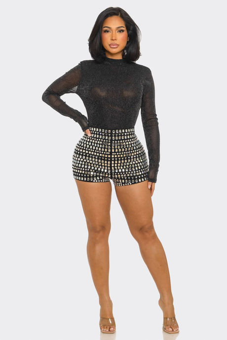 Romper de alto impacto con esencia glam nocturna. Diseño de manga larga en mesh negro con efecto shimmer que aporta un toque sensual y sofisticado, fusionado con una base tipo short de tiro alto completamente decorada con aplicaciones metálicas. Su silueta entallada realza la figura y convierte este look en una pieza statement, perfecta para noches especiales, eventos o cualquier momento donde quieras destacar sin esfuerzo.