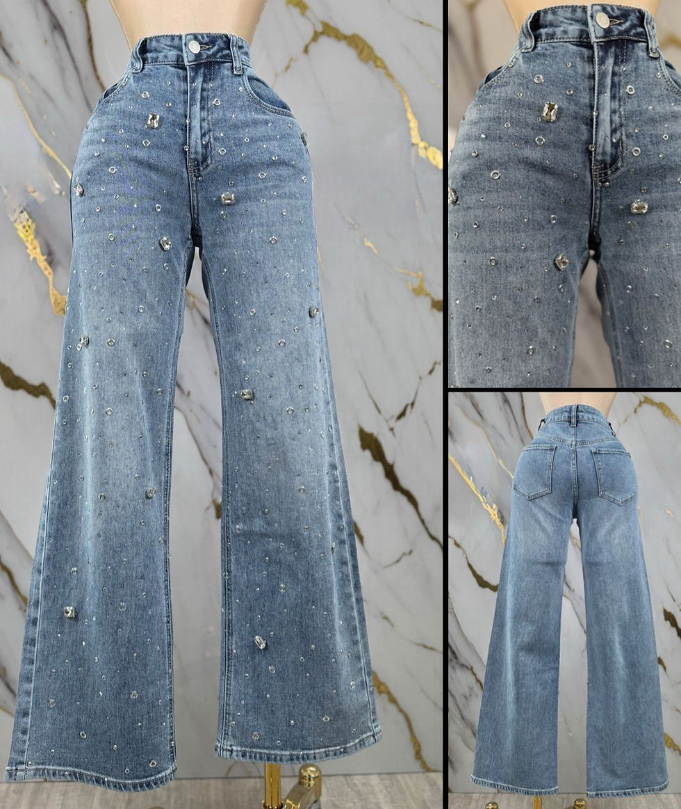 Pantalón de mezclilla de tiro alto con corte wide leg y caída fluida. Detalles de cristales dispersos que añaden brillo sutil, logrando un balance perfecto entre casual y sofisticado.